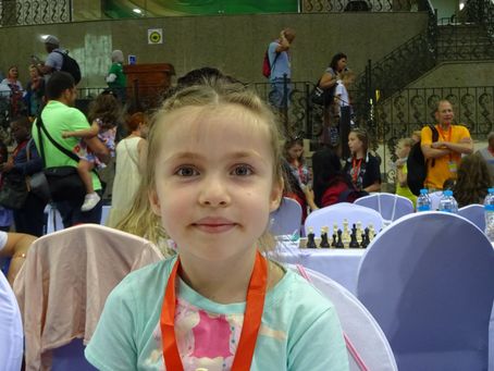 Zu Beginn lief es aber bei Meara gar nicht gut - da war die Aufregung wohl doch noch zu groß -, in der 2. Hälfte des Turniers dafür um so besser! Dort standen letztlich noch 5/7 Punkte für sie zu Buche. Auch die beiden verlorenen Partien der 2. Hälfte waren sehr hart umkämpft, gingen beide über 3, die zweite sogar fast 4 Stunden und Meara musste sich dann letztendlich nur im Bauernendspiel knapp geschlagen geben. In der letzten Runde konnte sie auch noch die bis dato DWZ-stärkste deutsche Teilnehmerin besiegen. Mit 5 von 11 Punkten errang Meara den 43. Platz bei den bis 8jährigen Mädchen weltweit. Mit diesem Ergebnis wurde sie zudem zweitbeste deutsche Teilnehmerin der U8w, punktgleich zur besten.