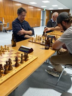 Nachdem Pascal den 2. Grand-Prix ausgelassen hatte, war er bei der nächsten Runde wieder in Top-Form mit dabei. Er musste aber ordentlich schwitzen, denn mit FM Andreas Mitscherling war ein starker Spieler von St. Pauli (!) mit dabei. Er besuchte seinen Sohn Fabian, der in Trier lebt und ebenfalls mitspielte. Damit gewannen sie auf jeden Fall den Preis für die weiteste Anreise, auch wenn ihnen Luca (ist unter der Woche aktuell in Thüringen) in dieser Kategorie starke Konkurrenz machte.