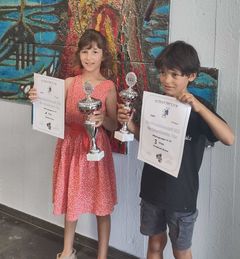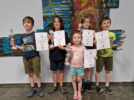Bedauerlicherweise nur vier Kinder waren hier am Start, zwei davon von uns: Meara Classen und Daniel Krämer. Für den gerade mal fünf Jahre alten Daniel war es eines seiner ersten Turniere überhaupt, Meara hingegen verfügt für ihr Alter bereits über enorme Erfahrung, unter anderem bei Deutschen- oder Weltmeisterschaften. Und so war es auch wenig überraschend, dass Meara am Ende vorn lag - dies gelang ihr äußerst dominant, mit 6 Siegen in 6 Partien in diesem Rundenturnier. Daniel gelangen ebenfalls zwei Siege und ein Remis, was ihn punktgleich mit Jaron Tesfai von der PST am Ende auf Platz zwei in der Tabelle brachte. Ein Blitzentscheid zwischen den beiden Jungs musste dann Daniel aber den Kürzeren ziehen, kann aber mehr als stolz sein auf seinen dritten Platz!
