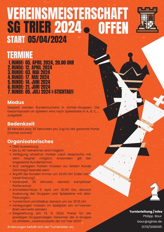 Von April bis Juli spielen wir wieder unseren Vereinsmeister aus. Gespielt wird im Modus Fischer Schnell (90min + 30sek). Voranmeldungen bitte an Philipp Baur (baur@sgtrier.de). Wir freuen uns auch sehr über Nicht-Vereinsmitglieder, die mitspielen möchten!