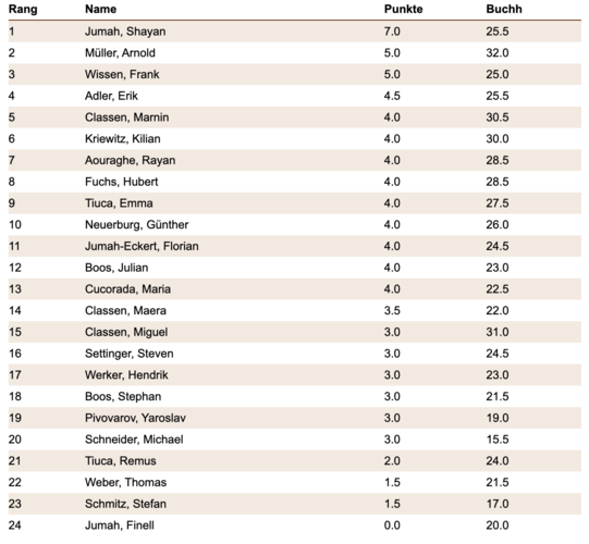 Auch von der SG Trier waren mehrere SpielerInnen am Start. Allen voran - wortwörtlich - Shayan Jumah der mit beeindruckenden 7 Siegen aus 7 Spielen überlegener Turniersieger wurde. Herzliche Gratulation!